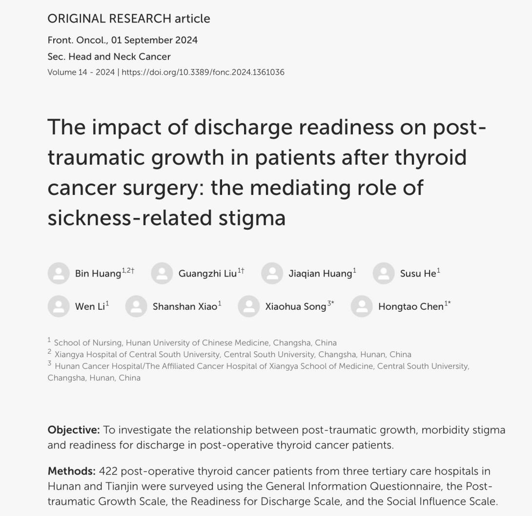 近日,我院在国际期刊《frontiers》发表题为“The impact of discharge readiness on post-traumatic growth in patients after thyroid cancer surgery: the mediating role of sickness-related stigma”的最新研究成果。该论文是基于出院准备对于甲状腺癌手术患者创伤后成长影响,特别关注疾病相关污名的中介作用的研究。我校为该文章的第一通讯单位,护理学院学生黄斌、刘光芝、黄佳倩、何素素、李雯、肖珊珊、宋小花,研究生导师陈红涛为共同第一作者。