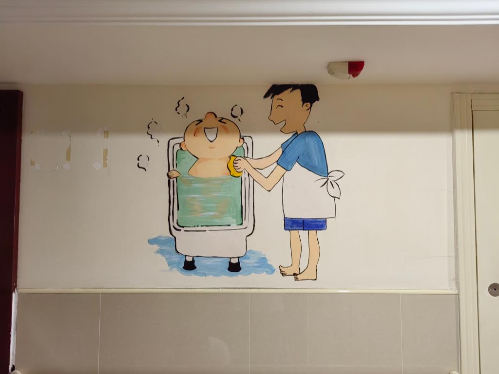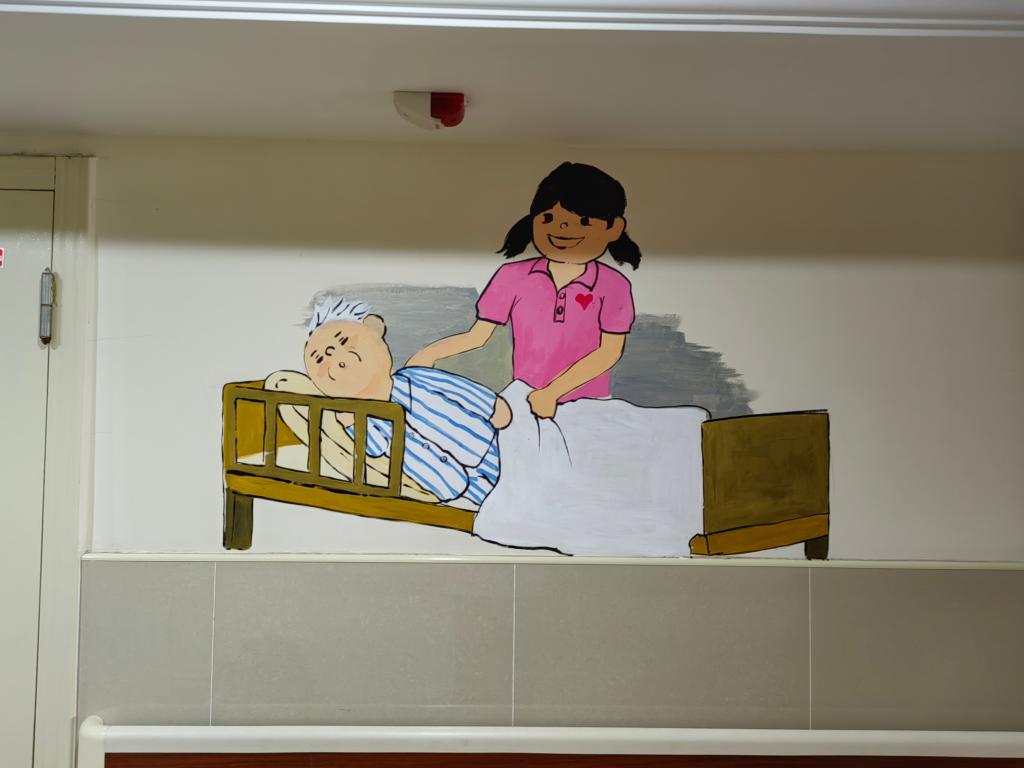 活动第二模块,学生们在福利院工作人员的协助下,分组为该院的老人们绘制了一幅幅充满爱心与温暖的壁画,壁画内容为护理工作者为老人开展日常护理的场景。在绘制过程中,学生们充分发挥专业特长,用心绘制每一笔,将专业与壁画进行融合,碰撞出一幅幅精美的作品。