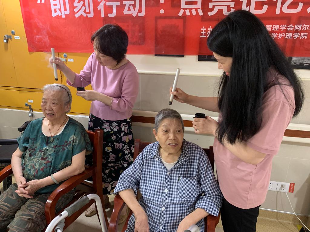 本次活动分两个模块。第一模块是为认知症老人实施中医护理技术,展示中医护理在阿尔茨海默病防控中的优势。活动现场,师生们耐心地为每位老人进行艾灸和耳穴压豆操作,同时详细解释了每种疗法的原理和预期效果。老人们在体验后普遍表示身心得到了放松,对中医护理技术的疗效给予了高度评价。