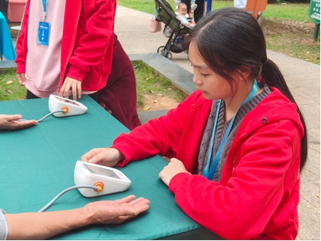 此外,志愿者使用血压仪为居民免费测量血压,逐一记录数据并标注风险等级。针对指标异常者,结合其饮食、运动习惯给出“每日盐摄入量控制在5克内”“每周保持3-5次中等强度运动”等个性化建议,居民们都为志愿者们讲述的专业知识连连称赞。