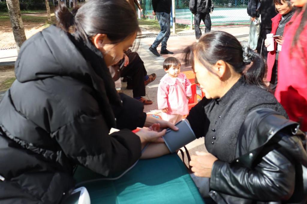 义诊现场气氛温馨而有序。血压测量区前,志愿者们耐心为居民测量血压,详细记录数据,并结合个体情况提供健康建议,提醒居民注意日常饮食与运动习惯。