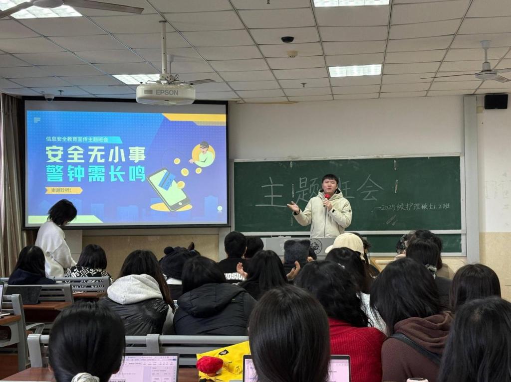 为切实增强学生防范电信网络诈骗的意识和能力,10月10日上午,护理学院组织2025级护理硕士1、2班全体学生,开展了以“预防网络诈骗,守护信息安全”为主题的宣传教育班会。本次活动旨在回应当前电信网络诈骗高发态势,紧密结合研究生群体学习生活实际,筑牢校园安全防线。