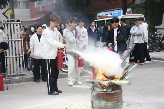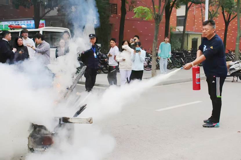 在演练的核心环节,专业人员现场演示了干粉灭火器的正确使用方法,并总结了“提、拔、握、压”四字口诀,同学们在专业指导下亲手操作,面对熊熊火堆,勇敢地完成了灭火任务。这场“真枪实弹”的体验,让大家真正掌握了扑救初起火灾的能力。