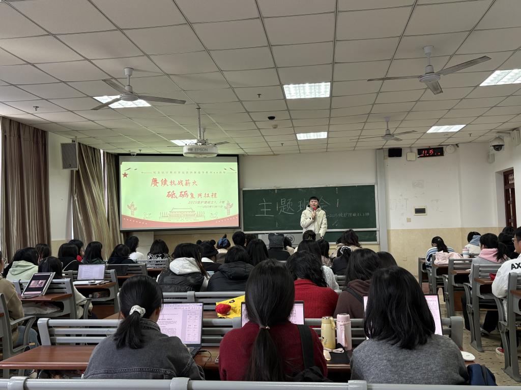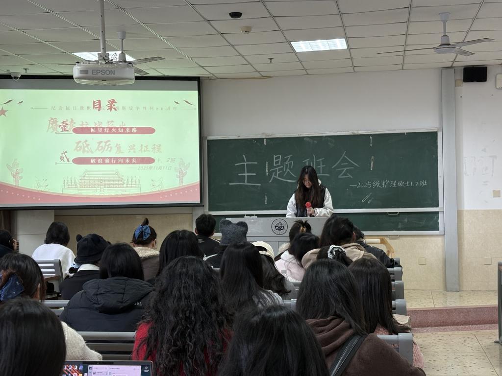 2025年11月11日,湖南中医药大学护理学院组织2025级护理硕士1、2班,开展“赓续抗战薪火,砥砺复兴征程”主题思想教育班会。此次活动紧扣中国人民抗日战争暨世界反法西斯战争胜利80周年节点,旨在传承抗战精神,推动家国情怀与护理专业深度融合。