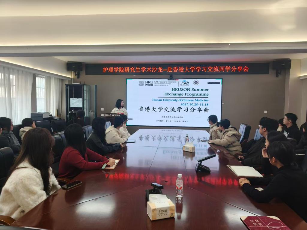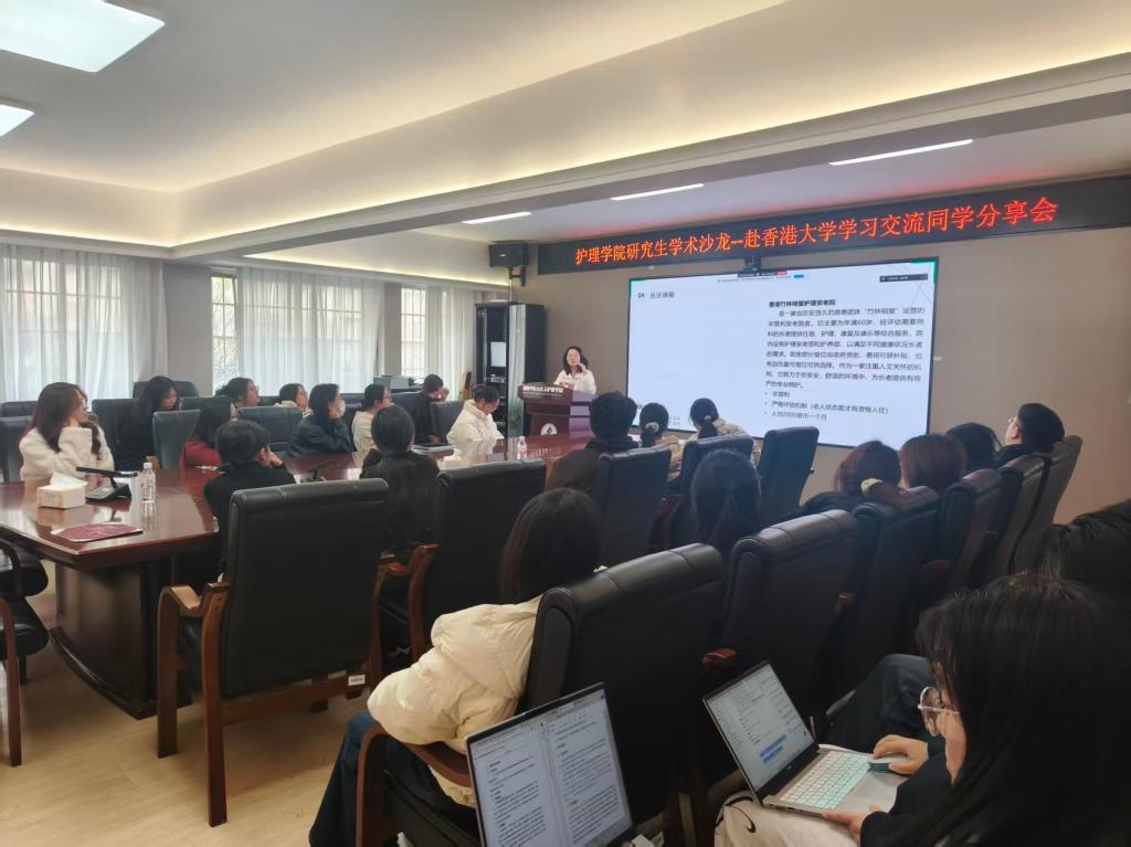 2025年12月29日下午14:00,护理学院研究生学术沙龙—赴香港大学学习专题分享会如期举行。本次分享会由护理学院2024级研究生谭佳人同学主讲,线下会场特别邀请学院院长陈偶英与25级30名研究生代表参与,同时通过线上直播面向全院研究生同步开放,搭建起跨校科研交流的学术平台。