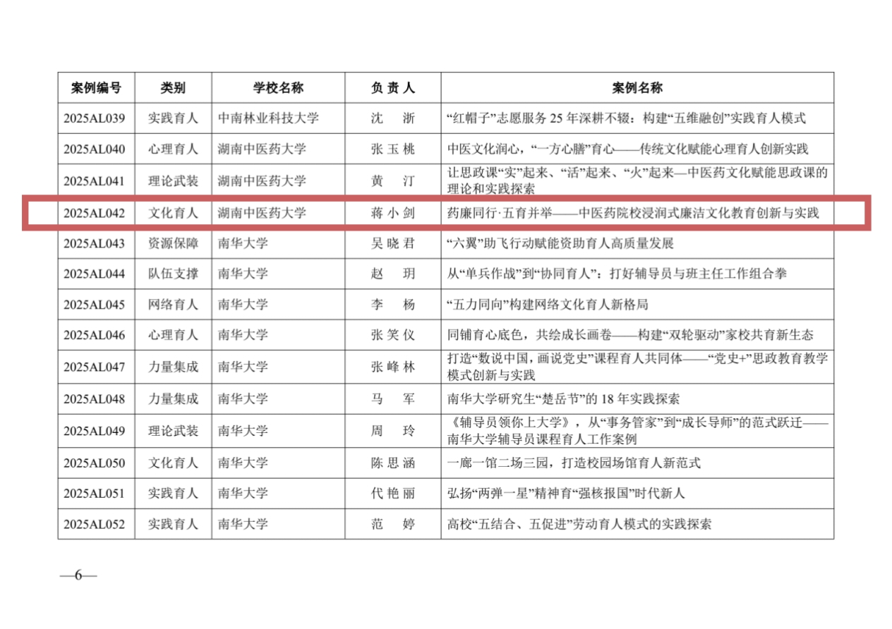 近日,中共湖南省委教育工委、湖南省教育厅等公布了2025年度湖南省高校思想政治工作优秀案例评选结果。我院报送的案例《药廉同行·五育并举——中医药院校浸润式廉洁文化教育创新与实践》(作者:湖南中医药大学护理学院党委书记蒋小剑)成功入选,获评优秀案例,为本校文化育人类唯一入选案例。