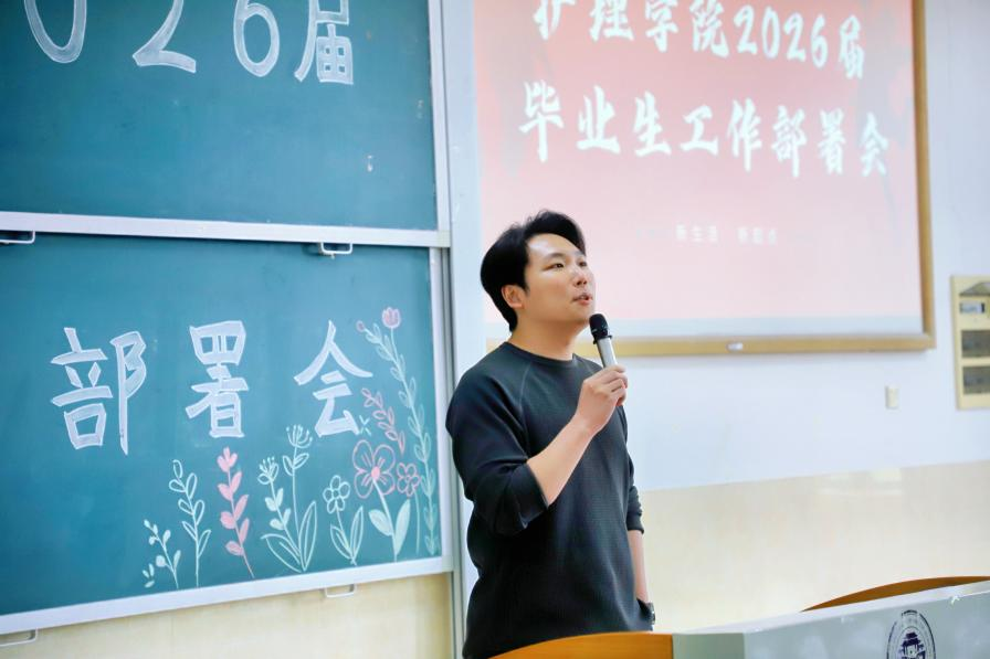 会议伊始,学院党委书记蒋小剑对2026届毕业生寄予殷切期望,希望同学们认清形势,既要仰望星空,也要脚踏实地;在最后的大学时光里严守纪律,顺利完成学业;在未来职业生涯中坚守医者初心,以专业与仁爱书写护理人的青春华章。