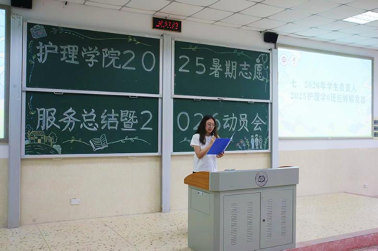 暑期“三下乡”社会实践活动回顾视频的播放,一幕幕往年的感人画面在大屏幕上重现,点燃了在场每一位同学的热情。紧接着,由主持人介绍嘉宾拉开了活动序幕。随后,肖丽老师上台致辞。在国家全面推进乡村振兴战略的背景下,她指出,“三下乡”活动不仅是对专业知识的检验,更是对青年学子社会责任感的锤炼。她殷切希望同学们能利用专业优势,深入基层、服务群众,在实践中增长才干,为健康中国建设贡献青春力量。