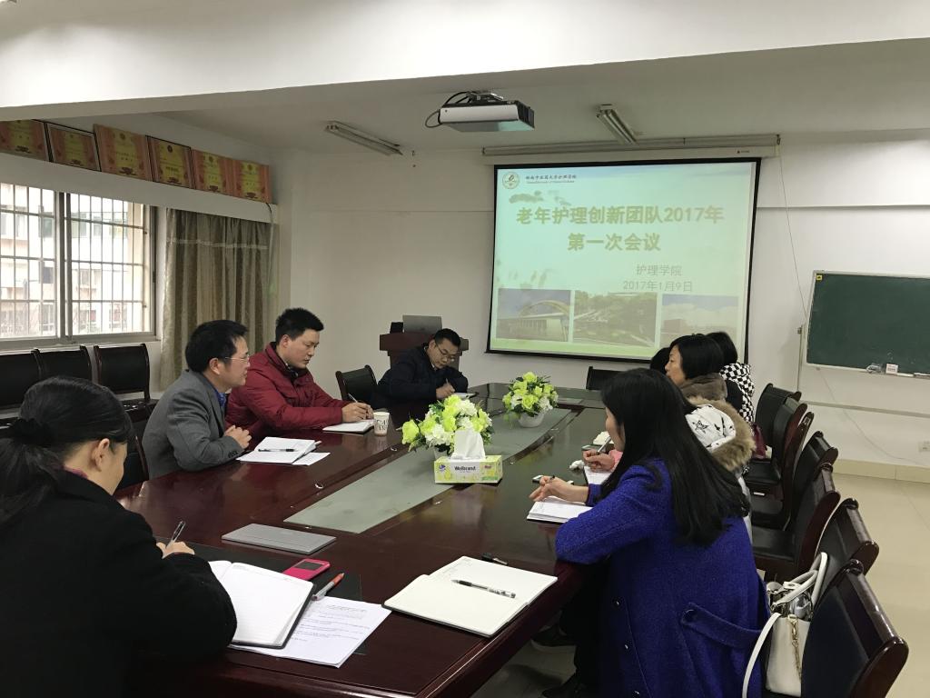 2017年1月9日下午,我院老年护理创新团队2017年第一次会议在学院会议室召开,中西医结合学院成绍武教授、护理学院罗尧岳院长、潘晓彦教授、陈偶英教授、张银华副教授、秦莉花副教授、晋溶辰老师、吉彬彬老师、朱正刚老师和杨金花老师等老年护理创新团队成员参加了此次会议。