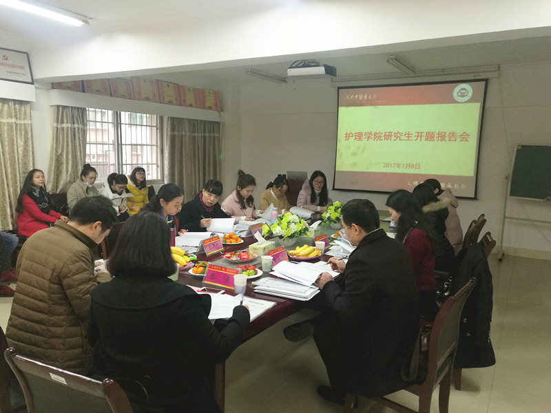 2017年1月8日,我院举行了2015级硕士研究生开题报告会。会议由朱正刚老师主持,莅临此次会议的有校内外8位专家,包括中南大学湘雅护理学院张静平教授、湖南省中医药研究院附属医院陈燕教授、湖南中医药大学中西医结合学院魏高文教授、湖南中医药大学护理学院罗尧岳教授、湖南中医药大学第二附属医院蒋谷芬教授、湖南省儿童医院朱丽辉教授、永州市第一人民医院蒋小剑教授、湖南中医药大学护理学院潘晓彦教授等。我院2015级、2016级研究生也参加了此次会议。