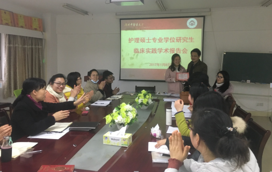2017年1月8日下午2:30,护理专业硕士研究生临床实践学术报告会在我院会议室召开,护理学院罗尧岳院长、陈偶英教授、朱正刚老师及全体研究生参加。