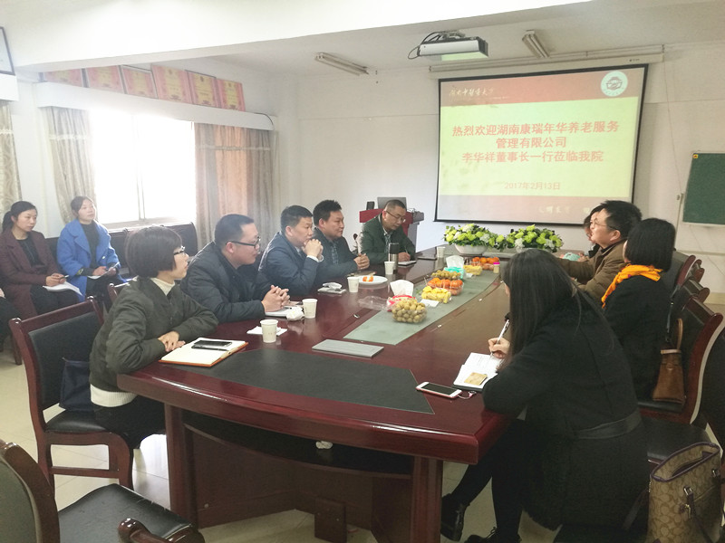 2017年2月14日,湖南康瑞年华养老服务管理有限公司李华祥董事长一行莅临我院学习交流,我院罗尧岳院长、潘晓彦教授、张银华副教授、办公室彭丽丽主任、朱正刚老师和外科教研室吉彬彬老师参加,罗院长主持会议。