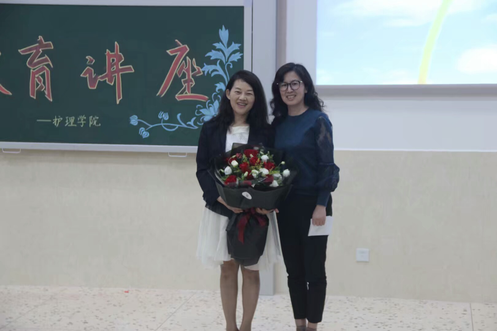 讲座最后,黄群副书记上台鲜花,并就此对陈燕教授的莅临表示衷心的感谢,同时祝愿我院新生们通过此次讲座明确专业的发展方向,了解护理专业发展优势,解决对专业学习的困惑。