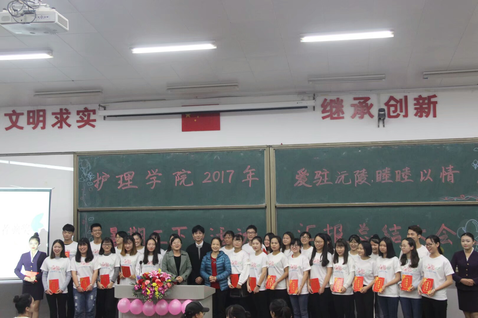 总结大会伊始,马老师发表了简短讲话,强调了三下乡活动的意义,提出对三下乡活动的美好祝愿。紧接着,志愿者代表肖纯、付雨洁、文芬、钟志康、聂李兵依次上台发表了自己的感想,讲述三下乡活动的经历和三下乡活动调研队、义诊队、支教队的各项工作。然后,分团委书记李程老师做了总结性发言,讲述前期准备工作情况,传达了此次三下乡活动获得了省级优秀团队等5个奖项的喜讯,并从责任、感动、成长三个方面总结了此次活动的收获。随后回顾三下乡视频,展示了活动的内容与意义。最后,马改红老师、裴芸老师及李程老师向志愿者颁发荣誉证书并合影留念。大会结束后,翼志愿义诊队开始组织现场招新,同学们踊跃参加。