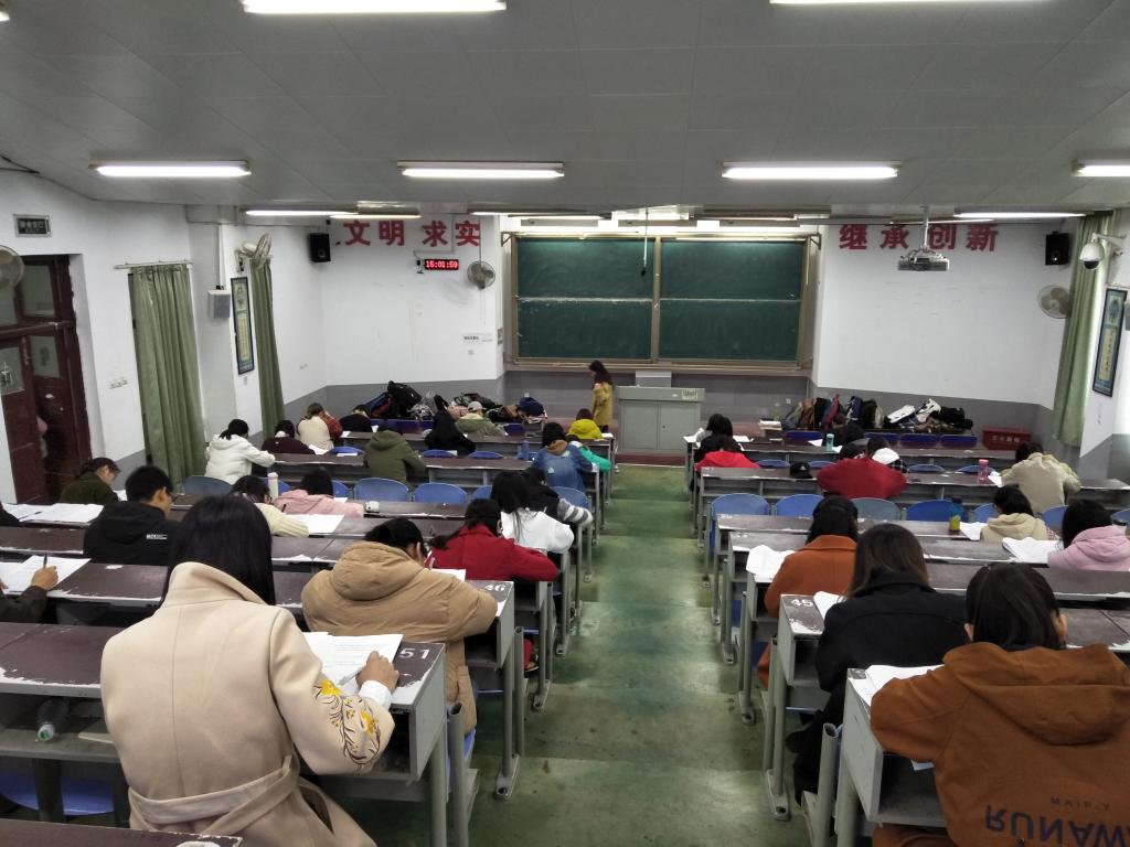 考试开始前,考生们按照学号迅速坐好位置,班委及学生会干部进行督促。各班班委向考生们发完试卷之后考试正式开始,考场工作人员不进行巡堂,考生埋头做题并自觉在考试结束后将试卷放在讲台自动离开考场。15、16、17级期中考试均未发生舞弊现象,"无人监考“顺利进行。