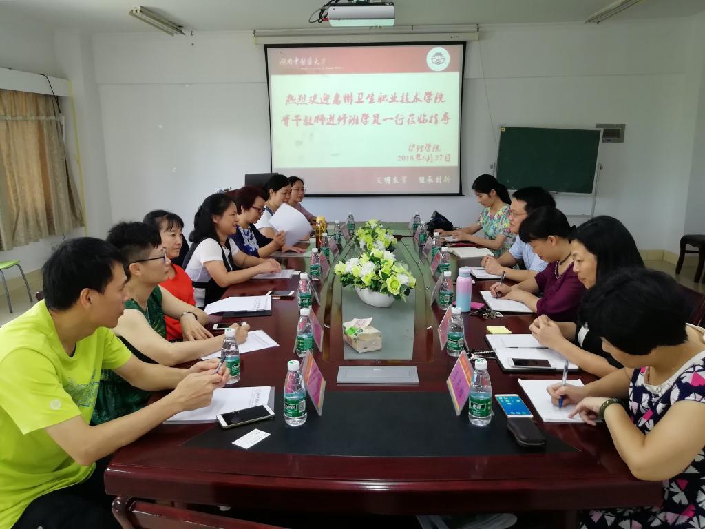 6月27日上午,根据大学(院)组织人事部安排,惠州卫生职业技术学院骨干教师进修班学员一行7人由护理系主任潘长玲教授带队莅临我院交流。我院党委书记、院长罗尧岳教授,副院长陈偶英教授,各教研室、实验中心主任,科教科参与交流。会议由我院党委书记、院长罗尧岳教授主持。
