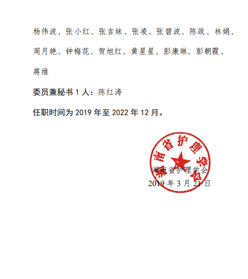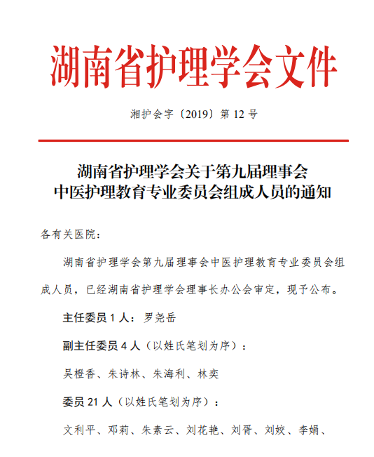 2019年3月22日,经湖南省护理学会理事长办公会审定通过,正式公布了湖南省护理学会第九届理事会中医护理教育专业委员会组成人员名单,我院罗尧岳教授当选为主任委员,我院成为中医护理教育专业委员会主任委员单位挂靠单位。本次中医护理教育专业委员会主任委员落户我院,实现了我院在学科建设、学术成果等方面的新突破,将对我院护理学校级重点学科建设、中医护理人才培养等具有积极影响。