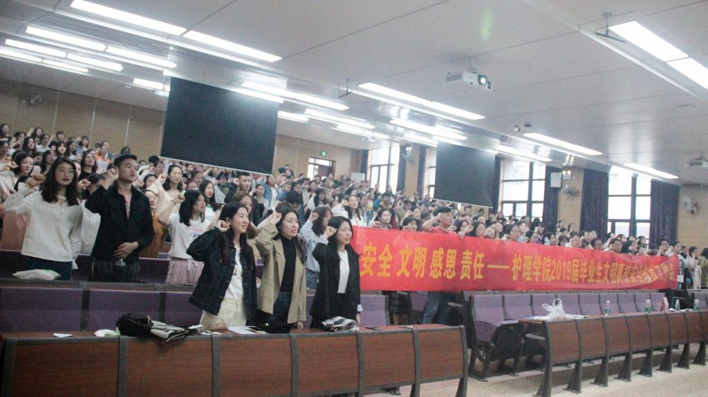 大会伊始,第一环节邀请了湘雅三医院护理部主任严谨主任做职业演讲,主任给我们分享了她的求学经历,她的人生历程,她对我们护院学子们的期盼。严谨主任的精彩履历与职业生涯让同学们心生敬畏,更明确了职业规划,她的成功让我们更深刻的去领悟她演讲中的这样一段话“万物万事都没有那么容易轻易得到,那也是我们为什么努力想要得到。”大会第二环节,由护理学院罗尧岳院长做总结发言,借严谨主任的演讲词,“梦想是最嘹亮的号角,奋斗是最鲜明的底色”,大学四年到这里结束,但人生的步伐从未止步,祝愿每位同学们以学校为跳板,创造更美好的未来。大会第三环节,由19届毕业生年级老师做关于毕业事宜的详细说明。详细介绍了毕业档案的存放,就业协议的处理,毕业答辩,毕业典礼等相关事宜。大会最后,由袁江豪同学带领我们就毕业生文明离校宣誓。