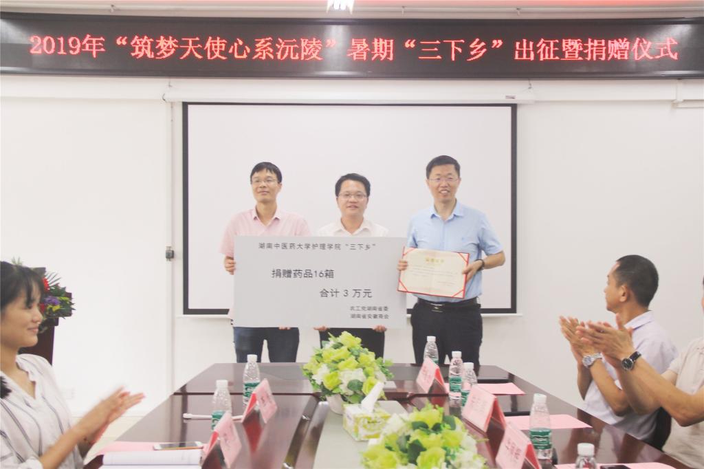 2019年7月3日下午3点,护理学院2019年暑期“三下乡”社会实践活动启动暨捐赠仪式于院办会议室顺利举行。出席此次活动的领导及嘉宾有:护理学院党委书记、院长罗尧岳教授,农工党湖南省委社会服务处罗创副处长,湖南安徽商会牛凤辉常务副会长等五位商会领导,我院科教科副科长陈红涛老师,学生科副科长黎亚老师。部分志愿者代表参与此次仪式,仪式由我院团委书记李程老师主持。