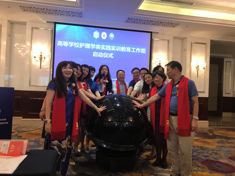 2019年7月28日,高等学校护理学类实践实训教育工作组成立大会在成都隆重召开。全国高等学校国家级实验教学示范中心联席会基础医学组组长董为人教授为大会致辞并宣布护理学组组长和副组长名单。国家教育部护理学类教学指导委员会秘书长、中华护理学会教育专委会副主任委员、北京大学孙宏玉教授担任组长,我院罗尧岳教授当选为副组长。董为人教授,孙宏玉教授以及罗尧岳教授等副组长们一起点亮启动球为工作组启航,现场气氛热烈。