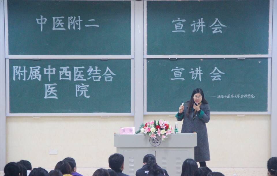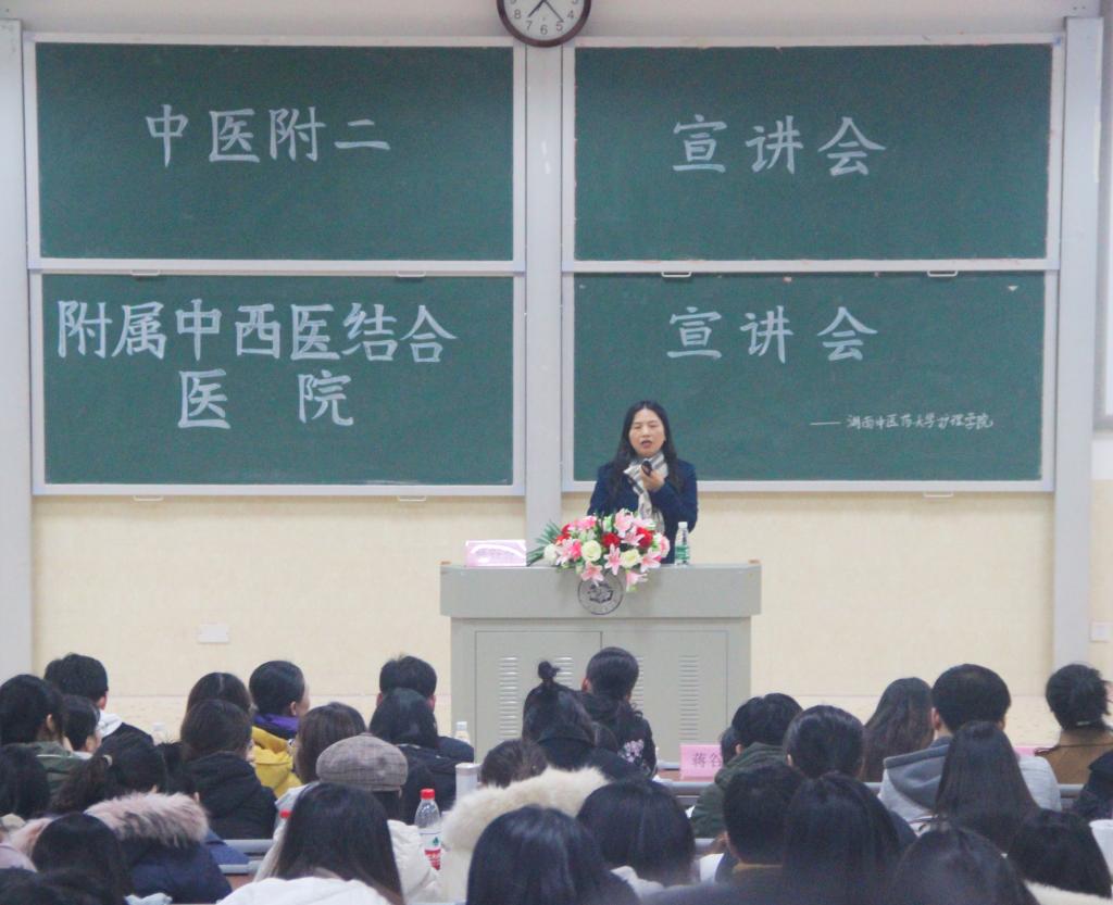 2019年12月19日晚7点,湖南中医药大学第二附属医院、附属中西医结合医院宣讲会于我校含浦校区3116教室开展。莅临本次宣讲会的领导和嘉宾有中医附二蒋谷芬副院长、护理学院陈偶英副院长、附属中西医结合医院临床护理教研室黄静主任、中医附二兰蓝老师、附属中西医结合医院林静老师、护理学院科教科副科长陈红涛老师、学生科全体老师以及17级全体学生。