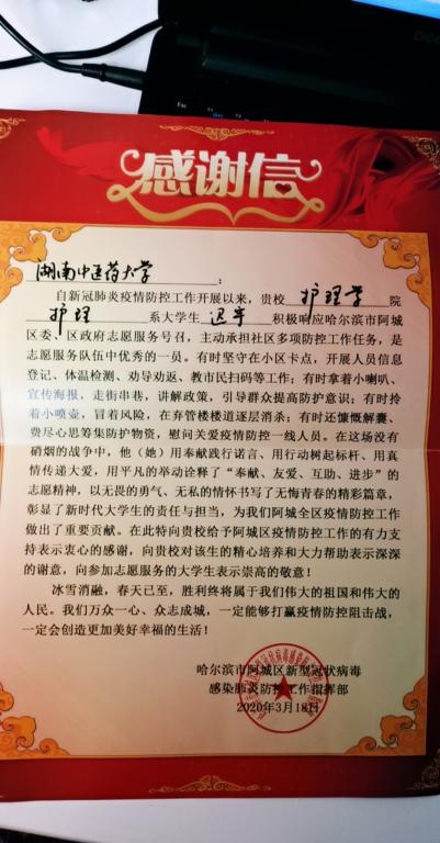 感谢信中这样表示:湖南中医药大学护理学院迟宇,积极响应哈尔滨市政府志愿服务号召,主动承担社区多项防控工作任务,是志愿服务队伍中优秀的一员。同时,也特向我校对该区防控工作的有力支持表示衷心的感谢,向我校对学生的精心培养和大力帮助表示常常的谢意,向参加志愿服务的大学生表示崇高的敬意!