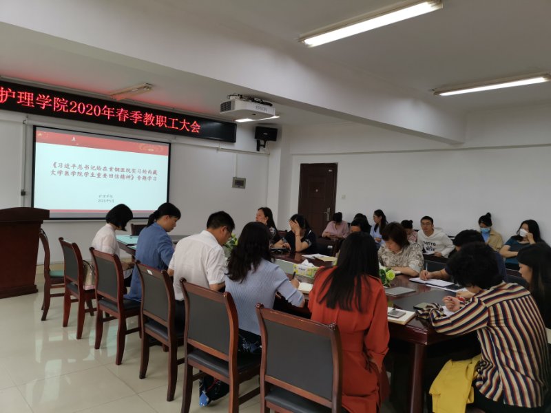 2月21日,习近平总书记给在北京大学首钢医院实习的西藏大学医学院学生回信,肯定了西藏大学医学院学生献身西藏医疗卫生事业的志向,勉励学生珍惜学习时光,练就过硬本领,毕业后到人民最需要的地方去,以仁心仁术造福人民特别是基层群众。日前,习近平总书记给在首钢医院实习的西藏大学医学院学生的回信在各大高校中引起了热烈反响。5月14日下午,护理学院召开全体教职工会议,以集体学习的形式,深刻领会、全面贯彻落实习近平总书记重要回信精神。