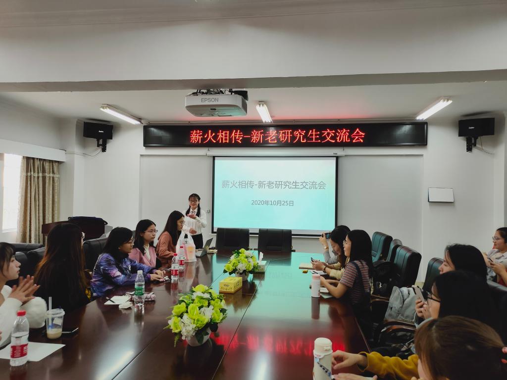 2020年10月25日下午,我院研究生会于院会议室组织举行了以薪火相传为主题的新老研究生交流会。研会特别邀请2018级研究生尹雨晴、胡姚佳,2019级研究生刘雨安、王紫艳作为经验分享者,2020级全体研究生参与了此次会议。