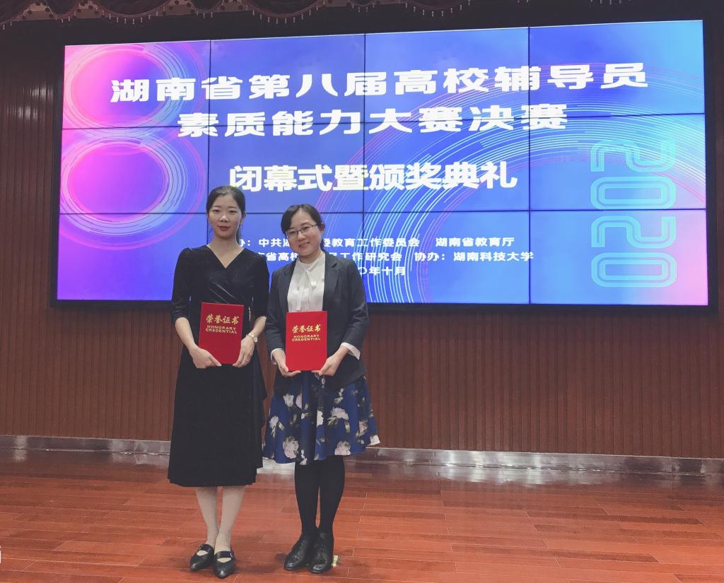 10月25-26日,湖南省第八届高校辅导员素质能力大赛决赛在湖南科技大学举行。经过激烈角逐,我院辅导员蒋雪、马改红两位参赛选手凭借扎实过硬的综合素质、职业能力和业务水平取得了个人好成绩,分别荣获大赛二等奖、三等奖。