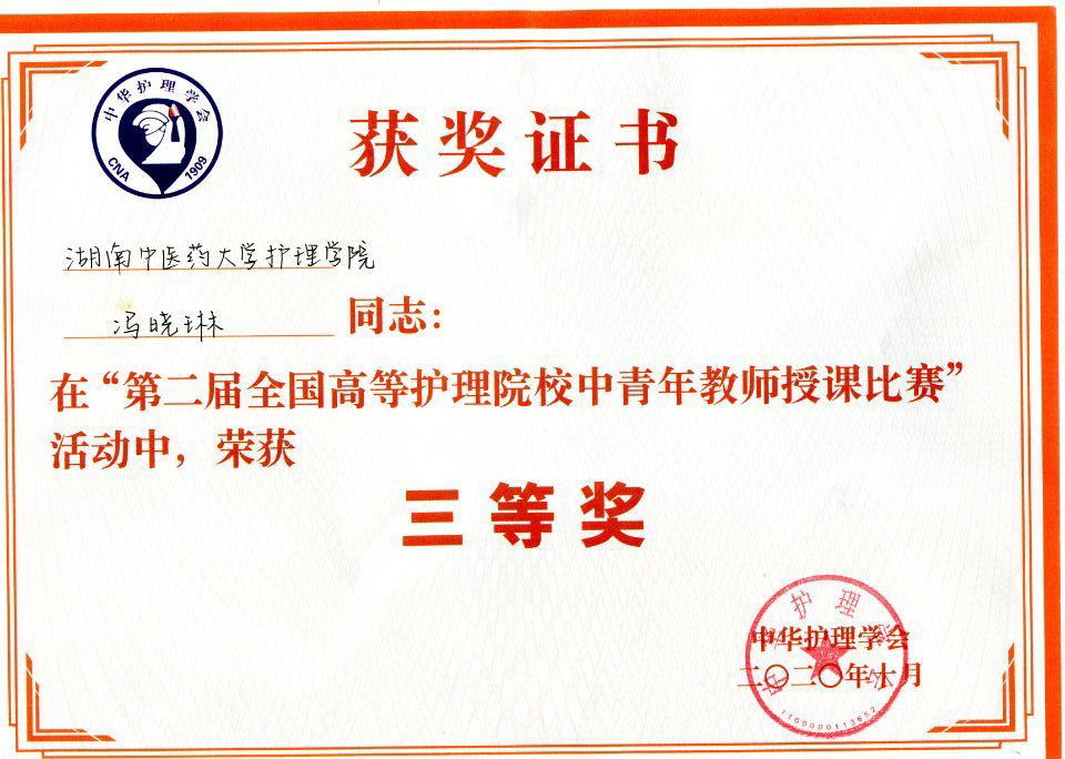 2020年10月30日,中华护理学会第二届全国护理院校中青年教师授课比赛在厦门火热开赛。我院罗尧岳院长带队,基础护理教研室青年教师冯晓琳披荆斩棘,荣获三等奖。