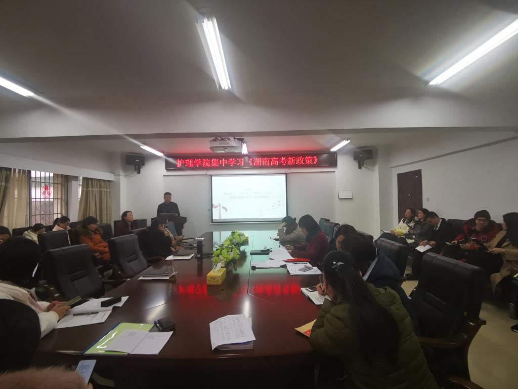 2021年1月5日下午,护理学院在学院会议室进行了《湖南高考新政策》的学习,科教科科长陈红涛老师领学解读,学院全体职工参加。