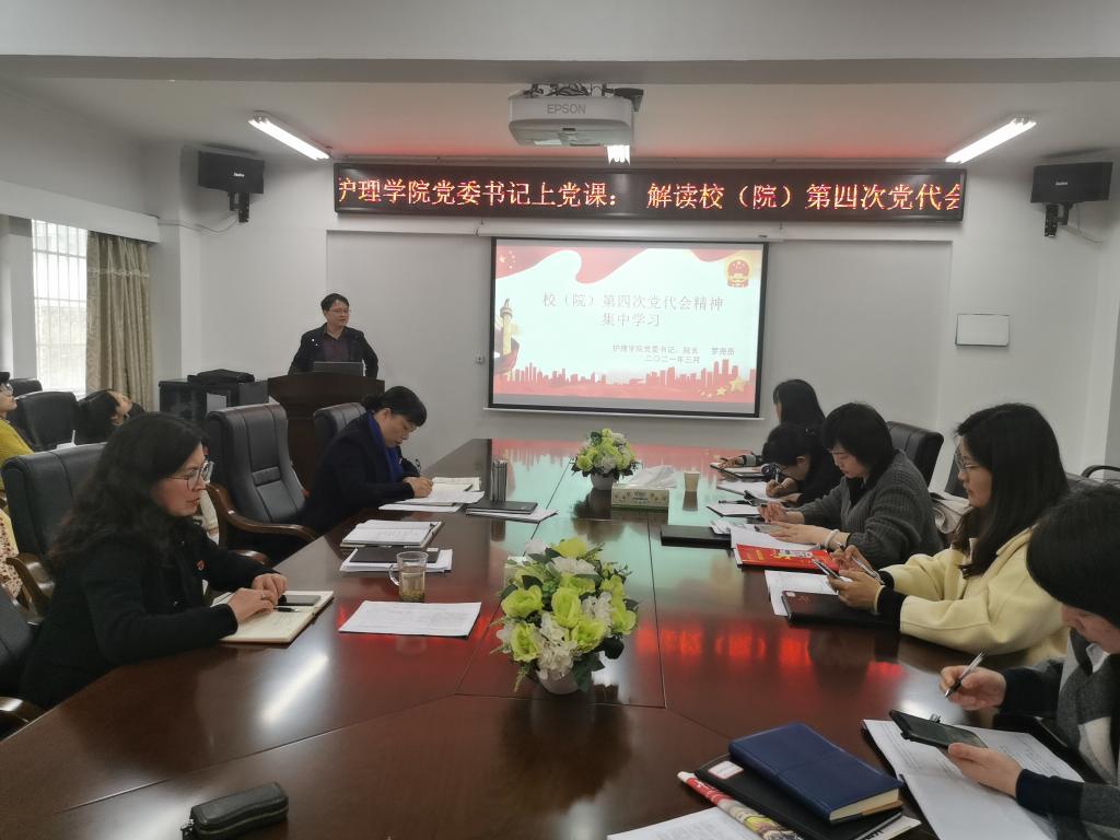 2021年3月12日,护理学院党委书记罗尧岳在学院会议室为全院师生党员上了一堂《解读解读校(院)第四次党代会》的党课。