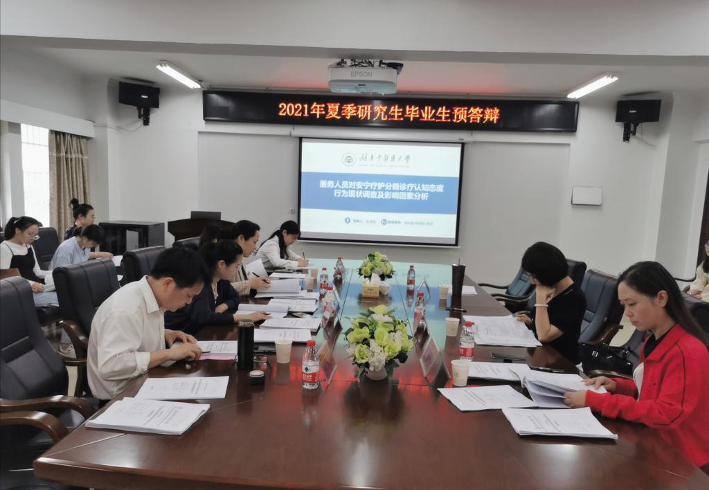2021年5月8日,我院举行2021届护理专业学位硕士研究生毕业预答辩,学院邀请中心医院吴传芳主任、研究院附属医院刘翔宇教授、中医附二朱诗林主任、以及我院陈偶英教授、李东雅教授参加了预答辩,为2021届毕业研究生毕业论文严格把关,提高质量。