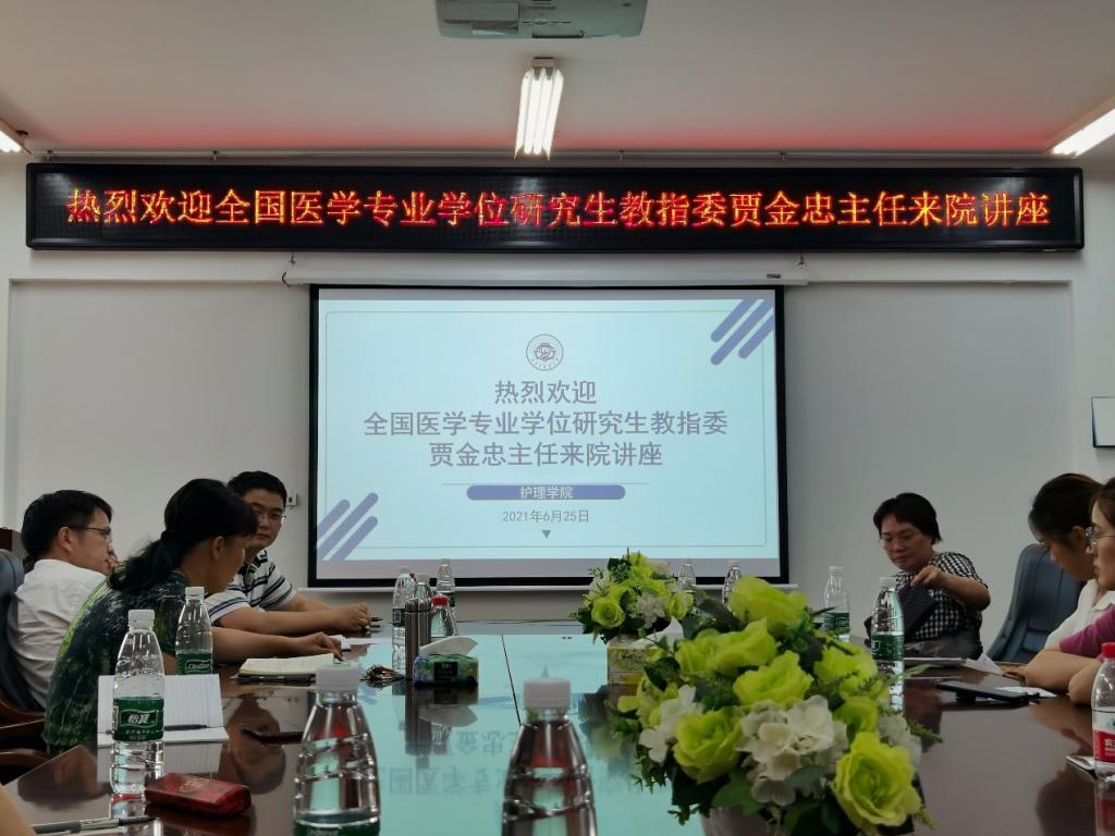为进一步推进护理专业研究生培养模式改革,提高研究生人才培养质量,6月25日上午,全国医学专业学位研究生教育指导委员会秘书处办公室主任贾金忠应邀来我校进行指导和学术交流。贾金忠主任以《研究生教育政策与护理学科》展开学术讲座。本次讲座在护理学院会议室隆重举行,由我院院长罗尧岳教授主持,副院长陈偶英教授、各实习基地研究生导师、我院教师及2020级全体研究生参加。
