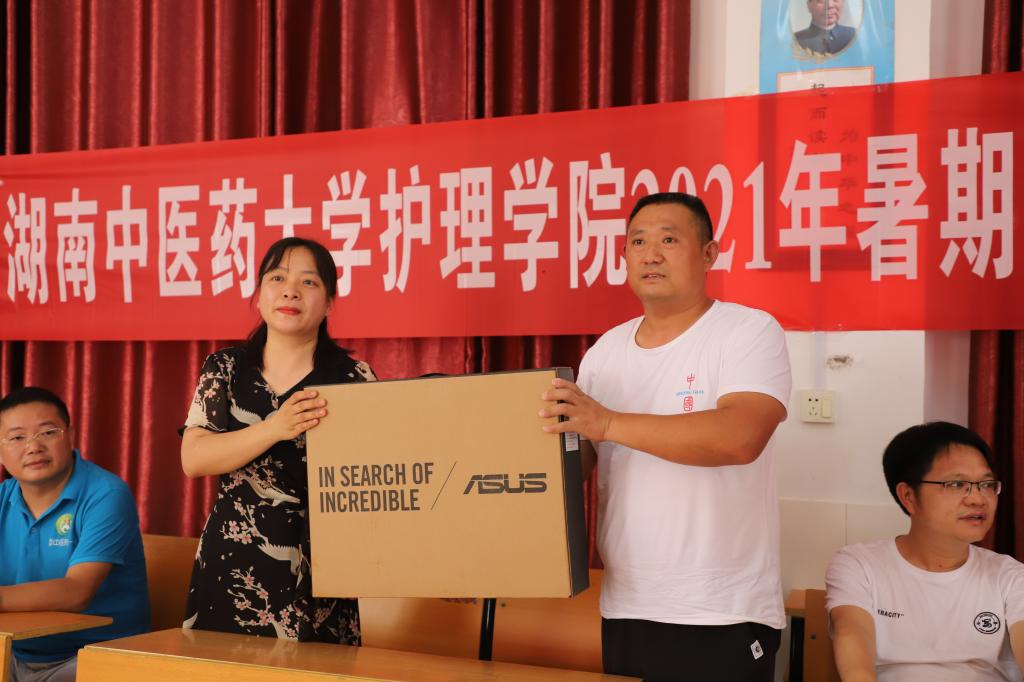2021年7月7日湖南中医药大学护理学院2021年暑期“三下乡”爱心物品捐赠仪式在杜家坪九校举行。沅陵县杜家坪乡党委张人超书记,沅陵县杜家坪乡李玉刚专职副书记,杜家坪九校向元清校长,护理学院党委书记、院长罗尧岳教授,护理学院党委吴湘副书记,教师代表贲定严老师、黄河老师、黄莹老师、林佳旭老师,以及九校在校学生和志愿者们参加了本次活动。