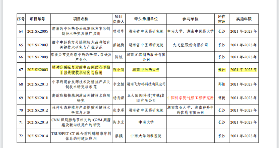 近日,湖南省科学科技厅发布了湖南省重点研发计划(2021-2022年)立项项目,我院蒋小剑教授研究团队申报的“精神分裂症复发的中西医结合早期干预关键技术研究与应用”获批立项,实现了我院重点研发计划项目的重大突破。