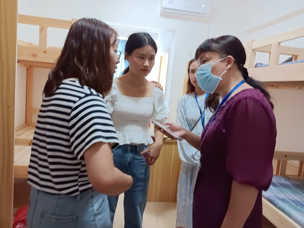随后,我院陈偶英副院长、邹灵玥老师及分研会主席谌一凡深入学生宿舍,视察住宿环境及宿舍各种设备,确保新生住的安心,住的舒服,并与家长、新生们亲切交谈,询问新生家庭情况,希望各位新同学能尽快适应校园的住宿生活,开始人生新的旅途。