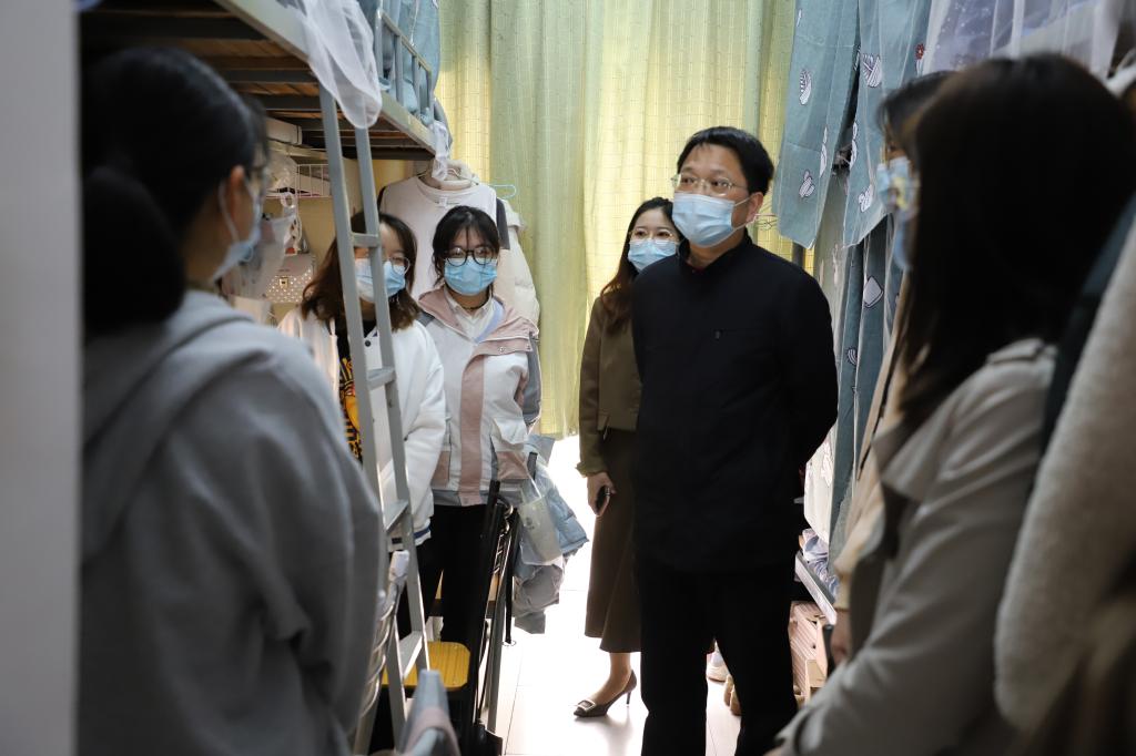 4月4日上午,护理学院院长兼党委书记罗尧岳、护理学院副院长蒋小剑、团委书记薛金凤和学生科各位老师一同前往宿舍走访了解学生线上学习情况,指出在疫情期间,仍要保持规律作息以及积极向上的学习状态与健康的心理状态。同学们对老师们的慰问表示衷心的感谢,纷纷表示会在疫情期间好好生活和学习。