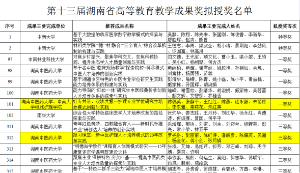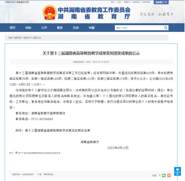 近日,湖南省教育厅公布第十三届湖南省高等教育教学成果奖获奖项目,我院罗尧岳教授领衔的教学团队、陈偶英教授领衔的教学团队荣获一等奖和三等奖各一项。湖南省高等教育教学成果奖作为全省教育教学领域的最高奖项,每四年评选一次,代表着我省高等教育教学改革与发展的水平。未来我院将继续推进省级教学成果的凝练完善,积极做好国家级教学成果奖的申报工作。