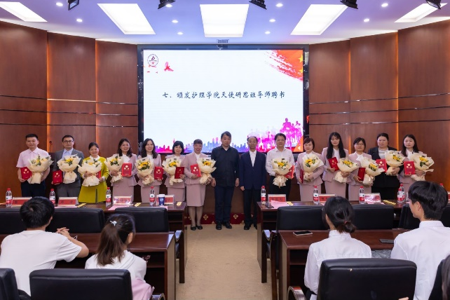 张湘明宣布护理学院天使研思班导师及学生名单。由廖菁、张湘明颁发护理学院天使研思班导师聘书;由护理学院天使研思班导师授予学生护理学院天使研思班学生徽章。学生代表彭俣兮发言,体现出了班级成员人人渴望成才、人人努力成才的优良风气;教师代表吉彬彬发言,体现出了导师们对科研认真,对教学负责的工作态度。