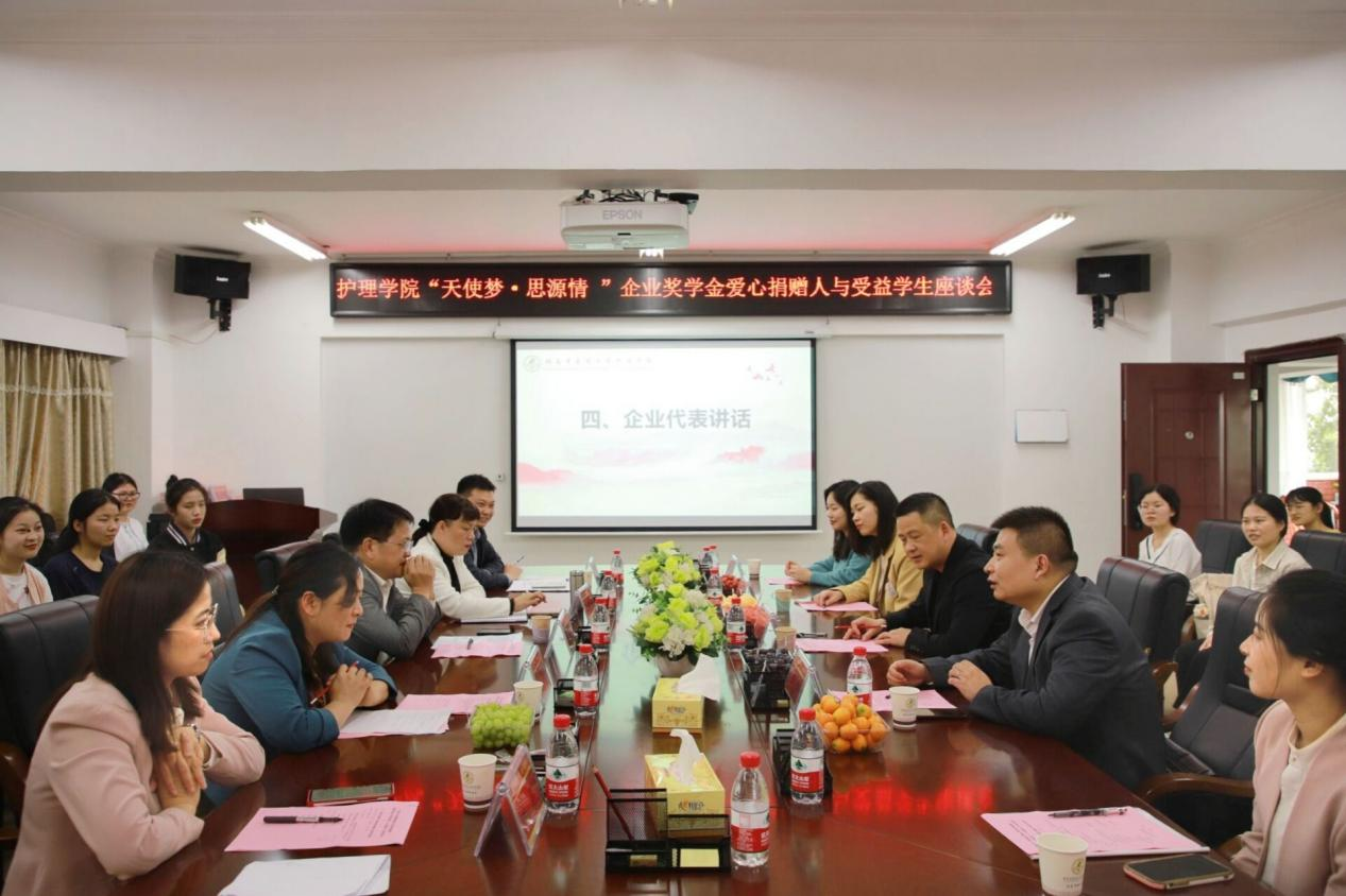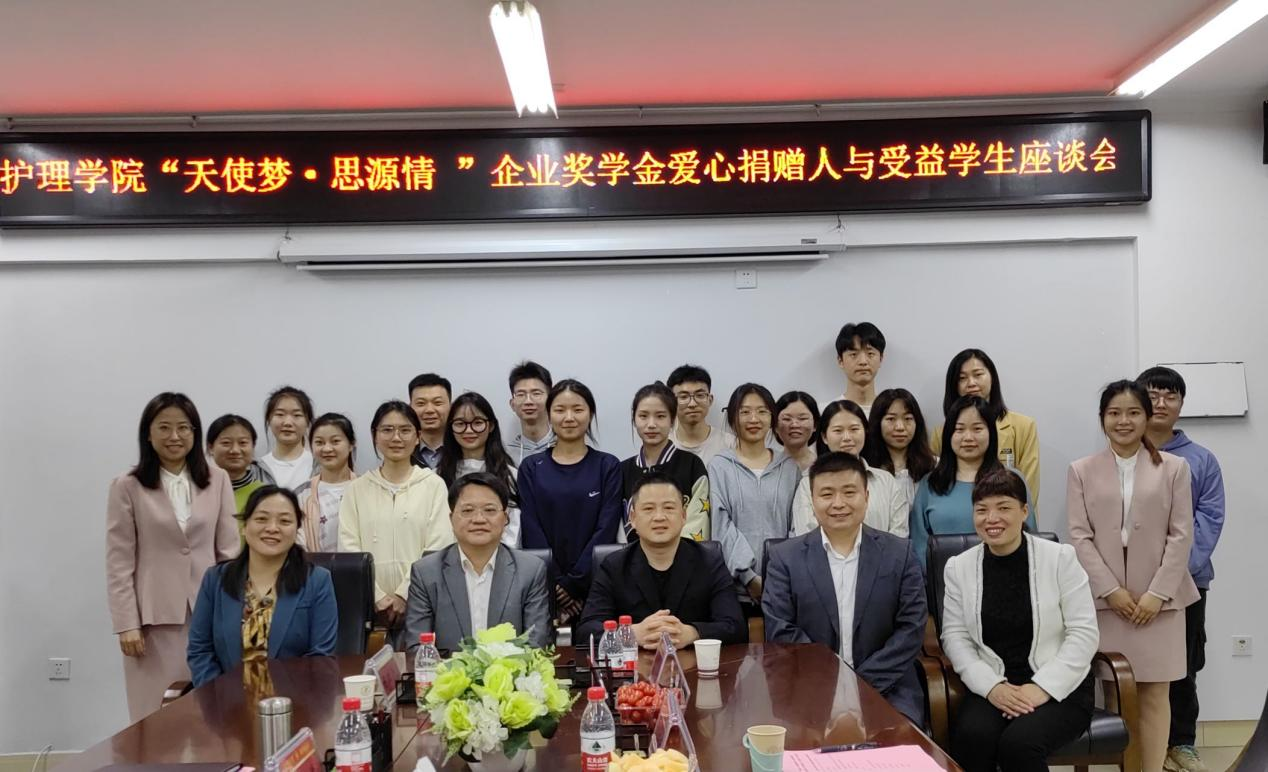 2022年5月11日下午15:30,我院在学院会议室举行了“天使梦·思源情”企业奖学金爱心捐赠人与受益学生座谈会。耀实通元健康产业公司总经理刘韬、人力资源部部长李云娇,湖南格尔智慧科技有限公司董事长李群、运营部部长刘莲,学院领导和16名获奖学生代表参加座谈会,会议由吴湘副书记主持。