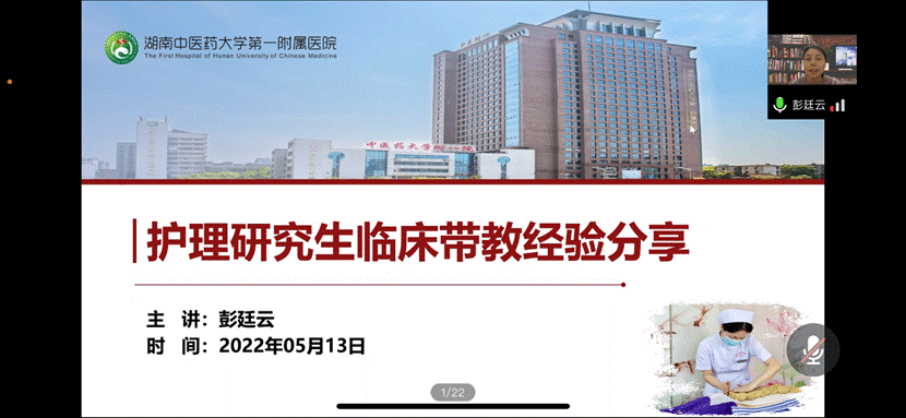 大会第二项议程,湖南中医药大学第一附属医院专硕研究生导师彭廷云为大家分享其临床带教经验。彭老师由中西医结合方向护理专硕研究生培养方案出发,落脚到临床科室专科小讲课和操作示范,再到出科考核内容如专科理论、专科操作技能、专科护理查房等全面的培养计划;积极带领专硕研究生参与医院培训及研讨会,提高专硕研究生的临床实践操作能力和科研能力。随后,彭老师强调,医院重视对我校护理学院专硕研究生生活上的关心,为专硕研究生积极提供补助,以便学生能心无旁骛地开展临床实践与科研学习。