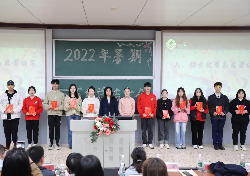 会议伊始,一段2022年暑期三下乡活动的视频勾起了大家的回忆,视频画面与旁白一同叙述着护理学院暑期三下乡活动于杜家坪村民、护理学院学子、青年志愿者群体的意义。会议第二项议程,由罗院长致辞,对认真筹备活动的所有志愿者成员表示感谢的同时,指出每年进行三下乡活动不仅是护理学院学子的一次社会实践机会,更是回应村民们期盼的一次次手把手的帮扶、心与心的连结。会议第三项议程,由暑期三下乡活动负责人代表吴美琳同学对2022年三下乡活动做总结汇报,她对青年志愿者在沅陵当地为期一周的义诊、支教及调研活动做出总结汇报,并表示青年七日之旅硕果累累,七日之事值得一辈子记住。会议第四项议程“情感同心,相伴同行”系列活动,志愿者们将自己写给小朋友的信件与明信片有序投入信箱,并观看来自杜家坪九校小朋友们的视频《我想对志愿者哥哥姐姐们说的话》,一句句简单的祝福、一些些点滴的回忆,是孩子们赤诚的心意。在志愿者刘慧敏同学上台分享用“互联网+”与小朋友与结对的经历后,会议开始进行第五项议程,领导老师们为在2022年暑期三下乡活动优秀志愿者颁发证书并合影留念。随后,会议第六项议程,优秀志愿者代表彭辉艳、毛郁含讲述自己参与本次活动的感悟与体会。会议最后,由志愿者们带来合唱节目《我爱你中国》,在志愿者们激情饱满、朗朗动听的歌声中,本次会议圆满结束。