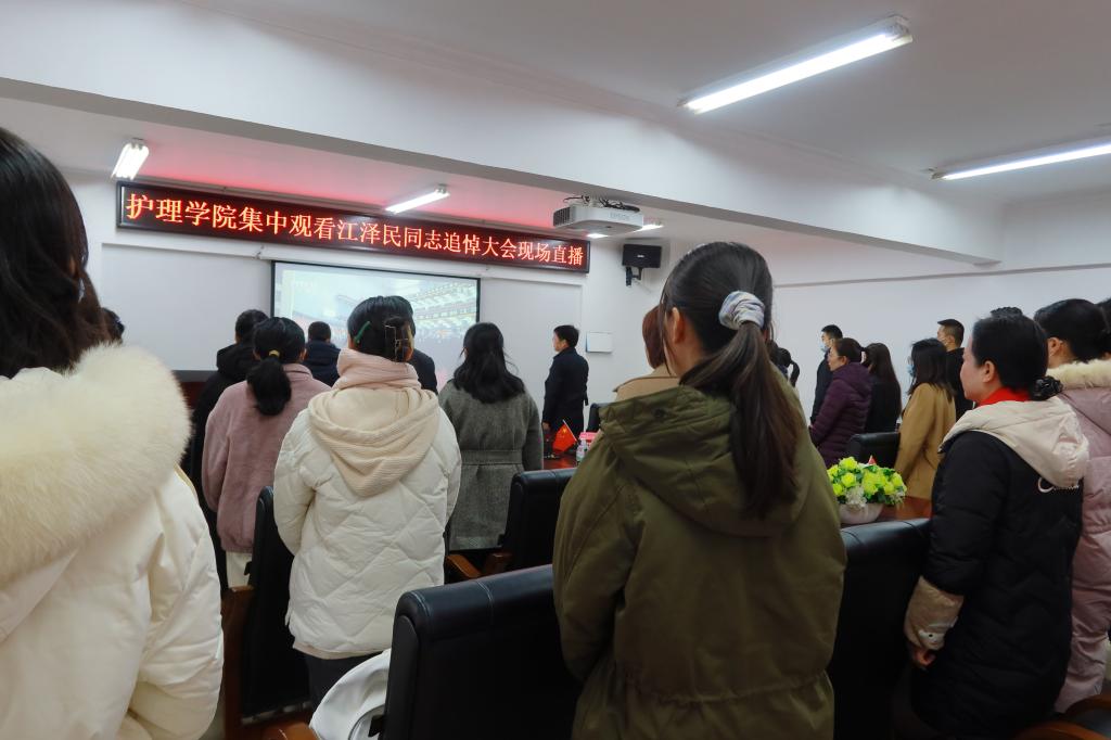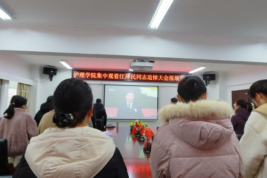 11月30日下午,江泽民同志逝世的噩耗传来,大江南北、长城内外,中华大地万众同悲。12月6日上午,护理学院会议室部分师生自发聚集一堂,参与哀悼活动,集中收看敬爱的江泽民同志追悼大会现场直播。会前,师生们首先收看了《告全党全军全国各族人民书》,缅怀江泽民同志的光辉业绩,颂扬江泽民同志的伟大情操和崇高品质,悼念这位我党我军我国各族人民公认的享有崇高威望的卓越领导人。上午10时,党中央、全国人大常委会、国务院、全国政协、中央军委在北京人民大会堂隆重举行江泽民同志追悼大会。庄严的人民大会堂,全场肃立,会场外,亿万人民同步默哀3分钟,低回的哀乐通过现场直播,传遍神州大地,举国同悲。在全场凝重的气氛中,习近平总书记致悼词,追思之情绵绵不绝。