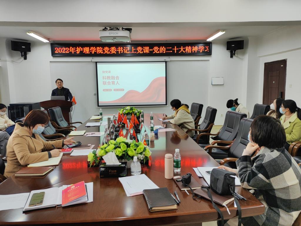 《关于新形势下党内政治生活的若干准则》规定,“党的组织生活是党内政治生活的重要内容和载体,是党组织对党员进行教育管理监督的重要形式”。护理学院党委为落实省委、大学党委的部署,着力解决“三会一课”形式化等问题,增强组织生活吸引力和实效性,各支部认真谋划,将深入学习贯彻党的二十大精神与开展“一课 一片一实践”活动有机结合起来,作为基层党建工作重点任务坐实。学院党委书记、院长罗尧岳于2022年12月14日下午亲自带头为所联系的职工支部上了一堂微党课。