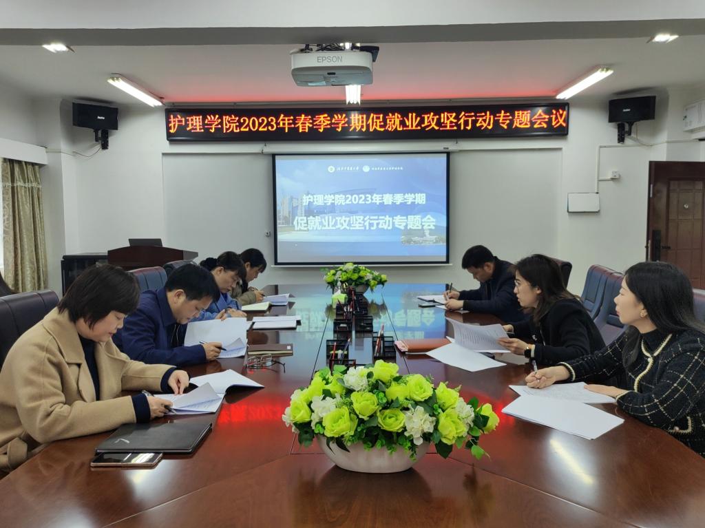 2023年3月22日,护理学院召开2023年春季学期促就业攻坚行动专题部署会,全体党政班子,科教科、办公室、学生科干部参加了会议。