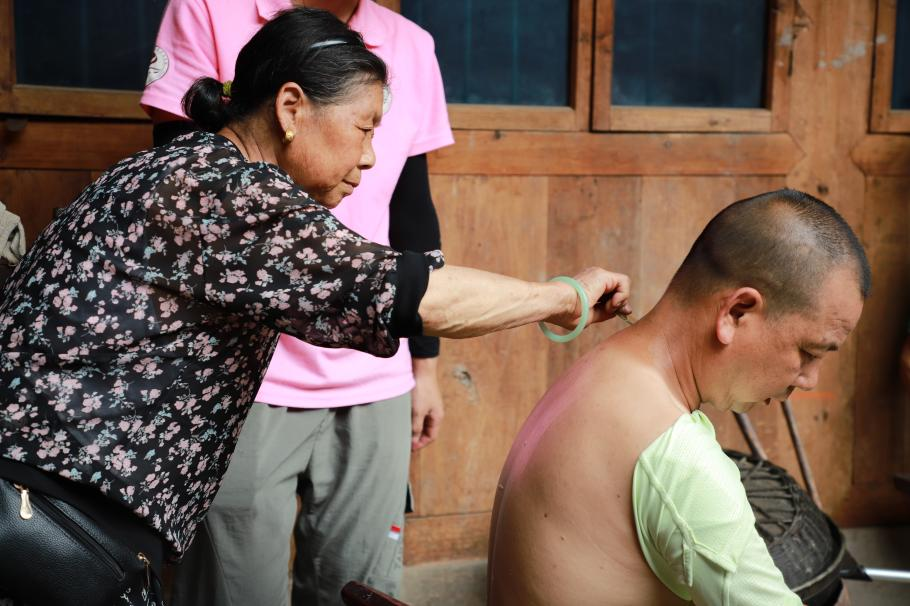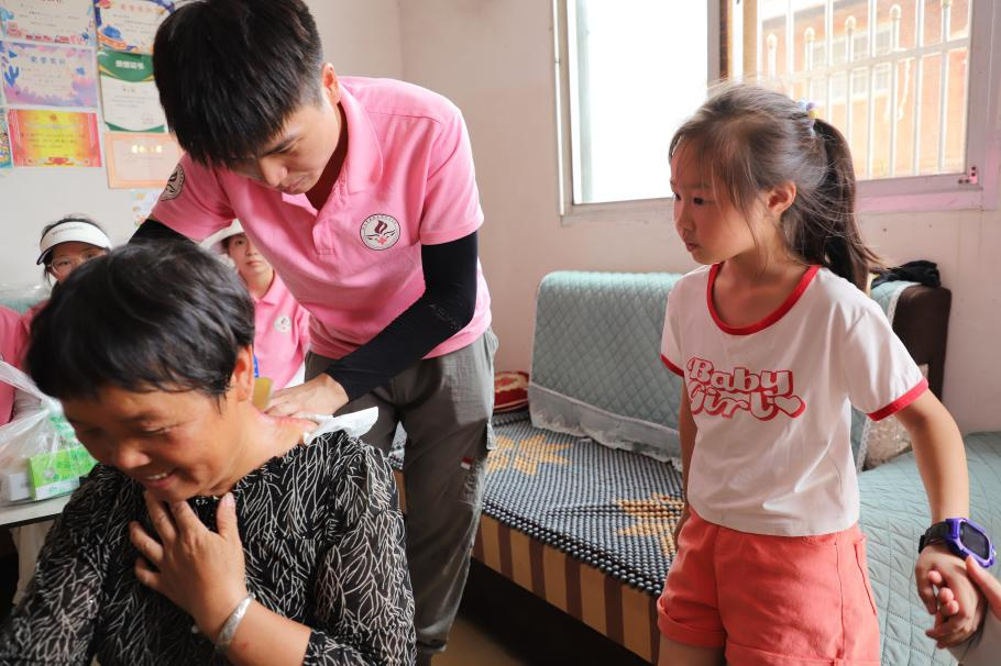 来到另一户留守家庭中,师生志愿团队探望了孩子及其亲属。志愿者们在照顾陪伴孩子的同时不忘关心家中的老人,运用刮痧和艾灸疗法缓解老人照顾孩子的疲惫。老师们根据其家庭结构的特点,向家中的老人讲述了治疗日常疾病的常用中医护理操作方法及适用于儿童的相关中医操作。