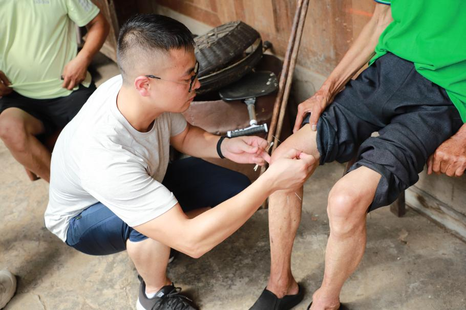 在一位老人的家中,志愿者与老人进行交流之后得知,该老人膝盖长期红肿疼痛,无法正常行走。经黄河辩证后,选择运用针灸疗法缓解其症状;学生志愿者为另一位老人进行刮痧疗法之后,为其进行刮痧技能培训,通过“他助”的形式达成“互助”的目的。