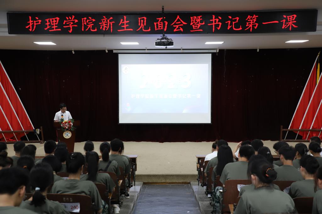 2023年9月10日下午,护理学院2023级新生见面会暨书记第一课于东塘学术报告厅举行。莅临本次大会活动的领导嘉宾有学院党委书记罗尧岳、院长陈偶英、副院长蒋小剑、副书记吴湘、副院长李春艳,各部门负责人、2023级新生班主任、学生科全体辅导员老师及2023级近440名新生。
