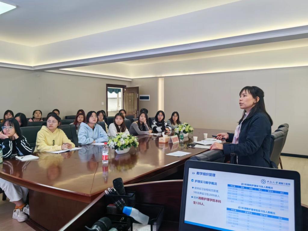 毛平教授首先从医院的视角向同学们介绍了湘雅三医院的优秀实习带教队伍机制,突出介绍了湘雅三医院带教老师从师资遴选、师资培训、师资考核以及师资队伍建设成效四个方面的特色亮点工作。接着从实习护士培养角度出发,向同学们介绍医院是如何培养一名优秀护士的。从实习前准备、报到管理、入科教育、过程培养、毕业辅导等五大方面介绍了湘雅三医院实习人才培养的具体举措。